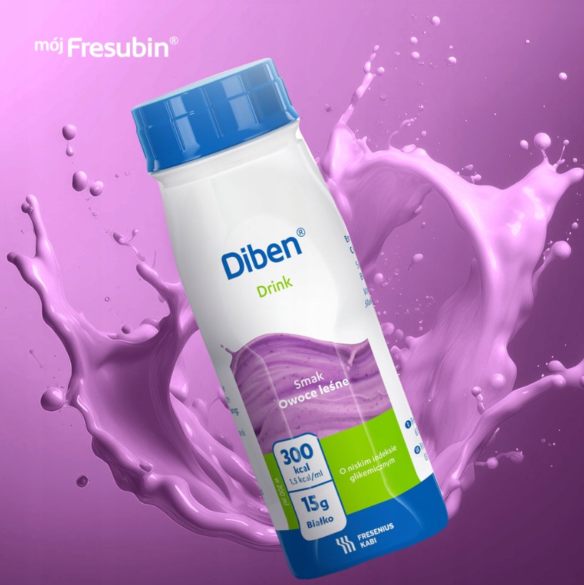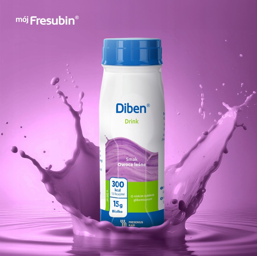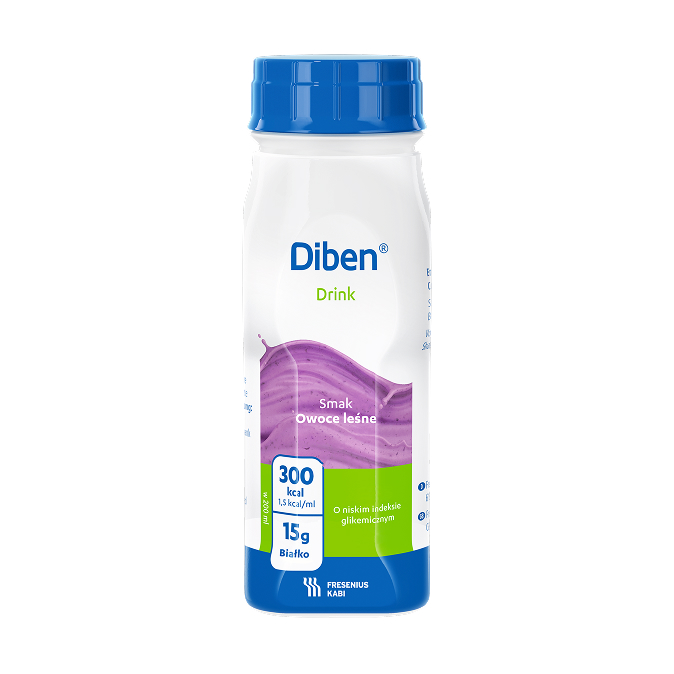 OpisDiben DRINK, smak owoce leśne, Kompletna dieta wysokoenergetyczna (1,5 kcal/ml), wysokobiałkowa, bogata w kwasy tłuszczowe jednonienasycone (MUFA), przeznaczona do żywienia drogą doustną. Zawiera węglowodany o spowolnionym uwalnianiu w celu lepszej kontroli poziomu glukozy we krwi oraz błonnik i olej rybny. Klinicznie wolna od laktozy, o niskiej zawartości sodu, bezglutenowa. Zawiera cukry i substancje słodzące.