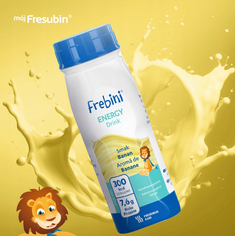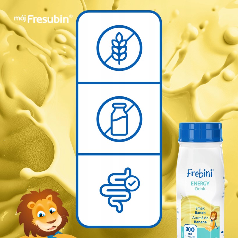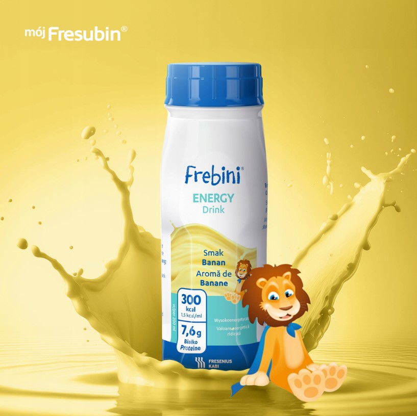 Frebini Energy DRINK, smak bananowy. Kompletna dieta wysokoenergetyczna (1,5 kcal/ml), przeznaczona do żywienia drogą doustną. Zawiera taurynę, karnitynę oraz inozytol. Nie zawiera błonnika, klinicznie wolna od laktozy, bezglutenowa.