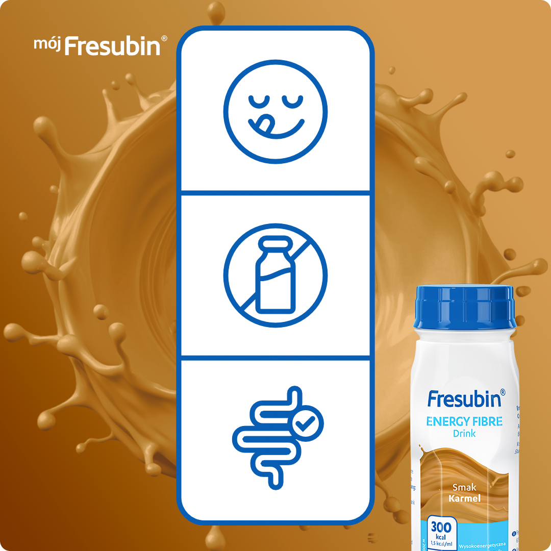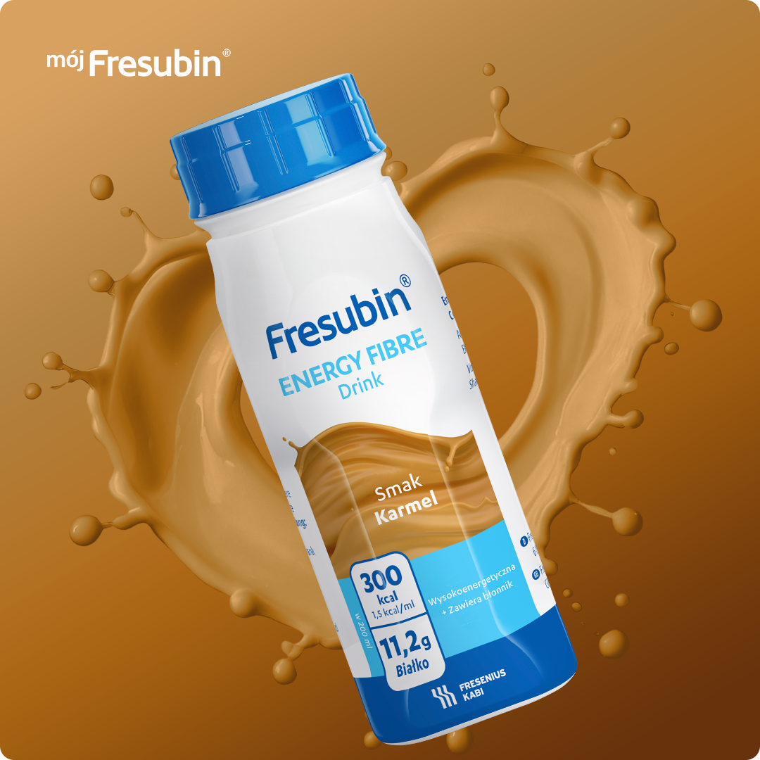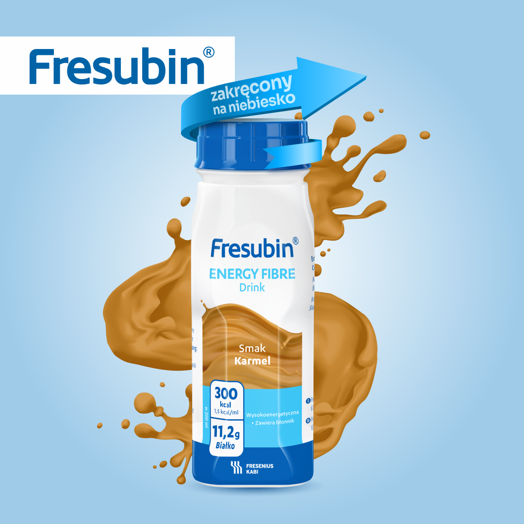 Fresubin Energy Fibre DRINK, smak karmelowy. Kompletna dieta wysokoenergetyczna (1,5 kcal/ml) z błonnikiem, przeznaczona do żywienia drogą doustną. Klinicznie wolna od laktozy, bezglutenowa.