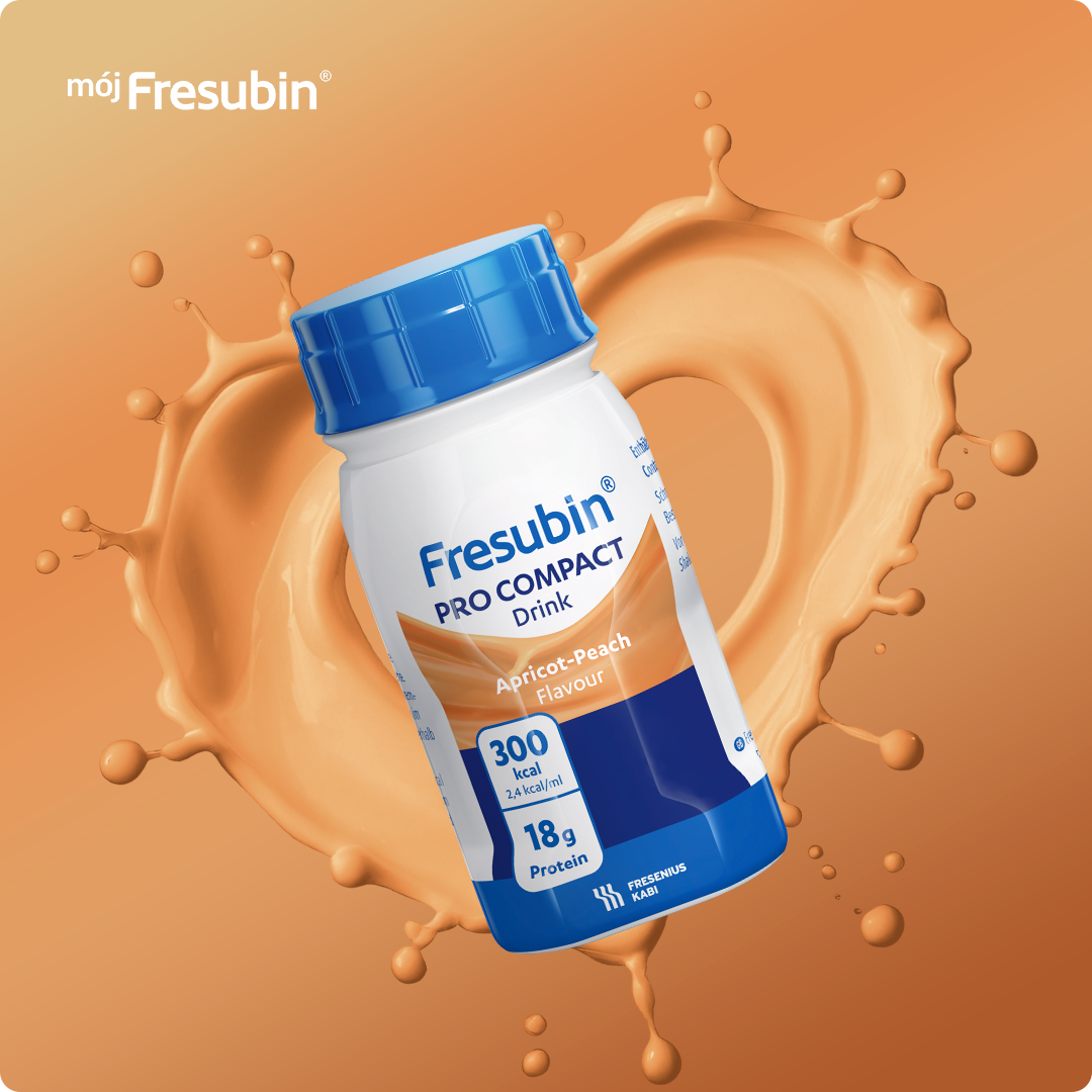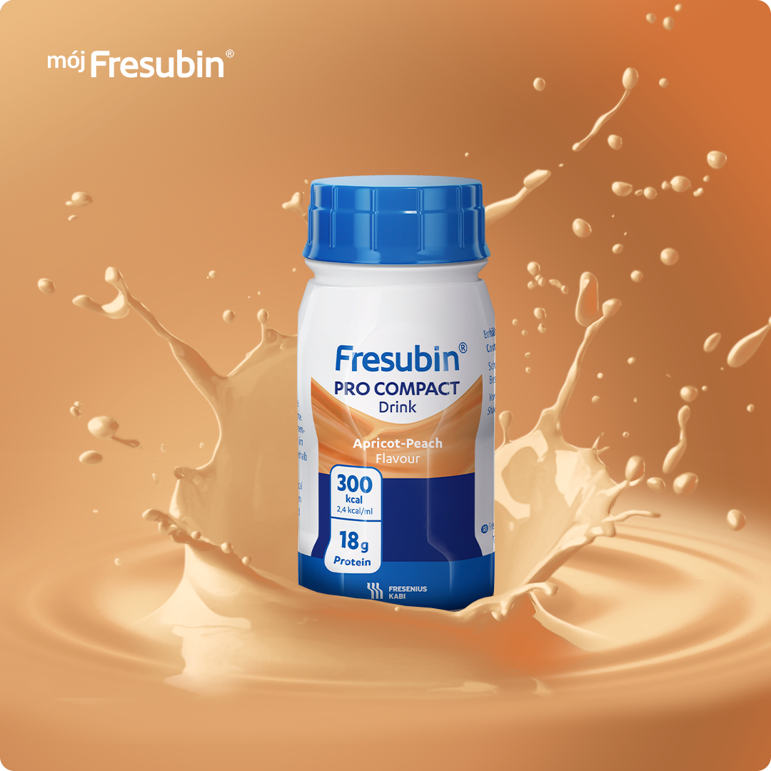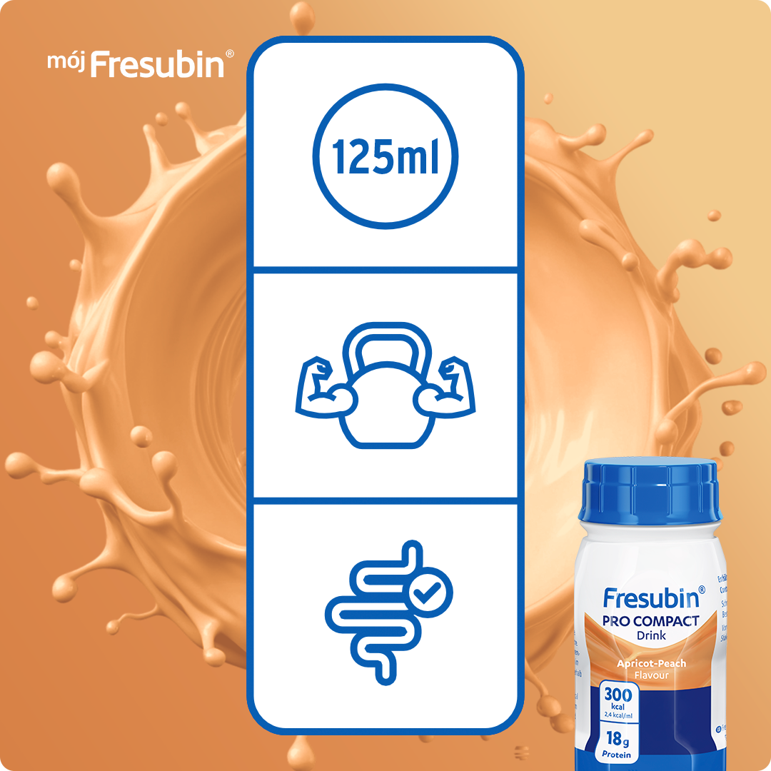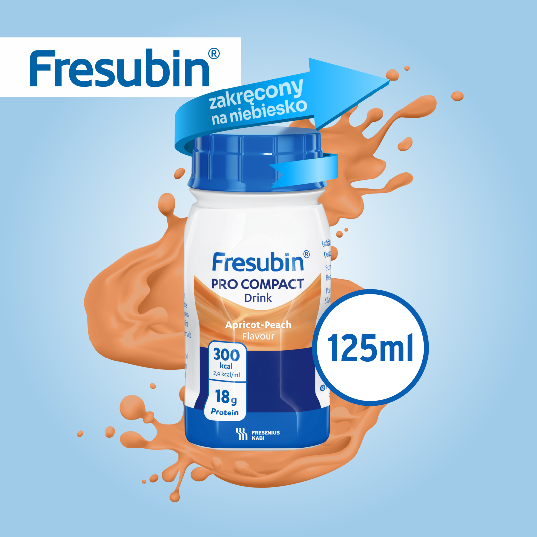 Fresubin Pro Compact Drink, smak morela-brzoskwinia. Niekompletna dieta wysokoenergetyczna (2,4 kcal/ml), wysokobiałkowa, o wysokiej zawartości wapnia oraz witaminy D, przeznaczona do żywienia drogą doustną. Klinicznie wolna od laktozy, bezglutenowa.