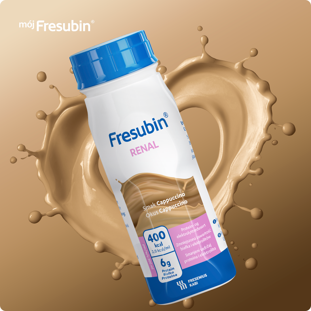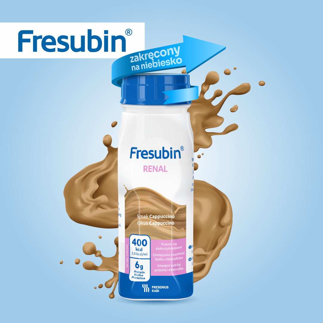 Fresubin® RENAL Smak Cappuccino. Kompletna dieta wysokoenergetyczna (2,0 kcal/ml), o zmniejszonej zawartości białka (6% energii) oraz elektrolitów: sodu, potasu, fosforu, przeznaczona do żywienia drogą doustną lub przez zgłębnik. Zawiera węglowodany o spowolnionym uwalnianiu, błonnik oraz olej rybny. Klinicznie wolna od laktozy, bezglutenowa.