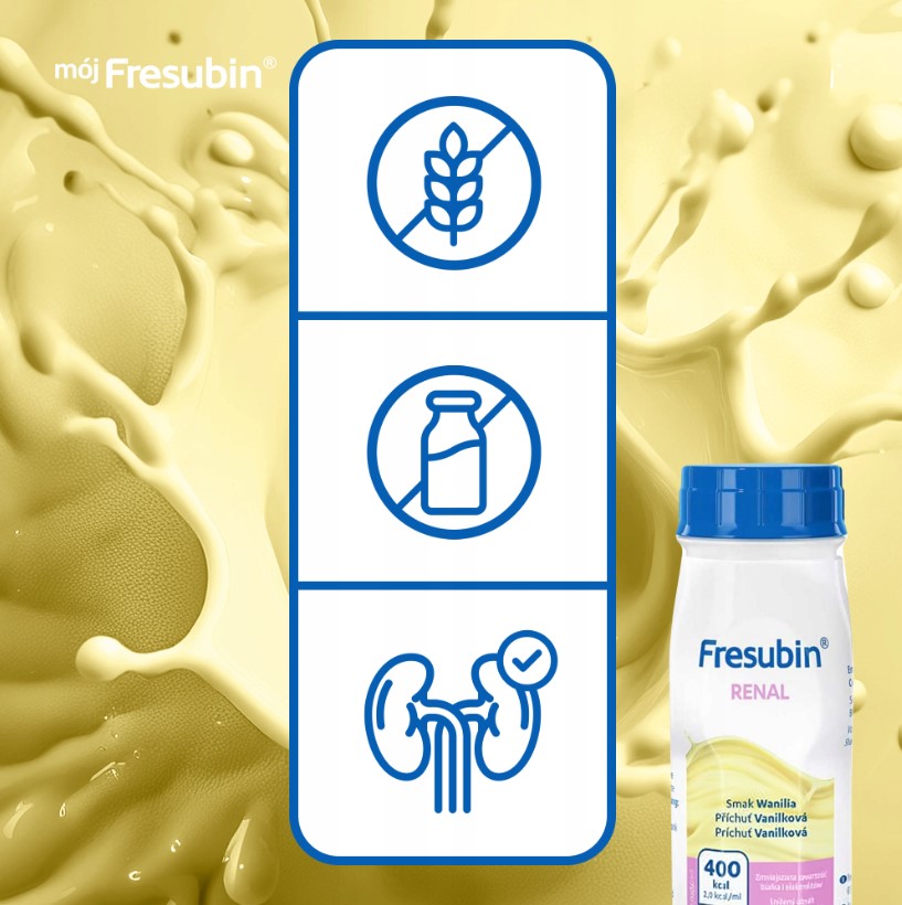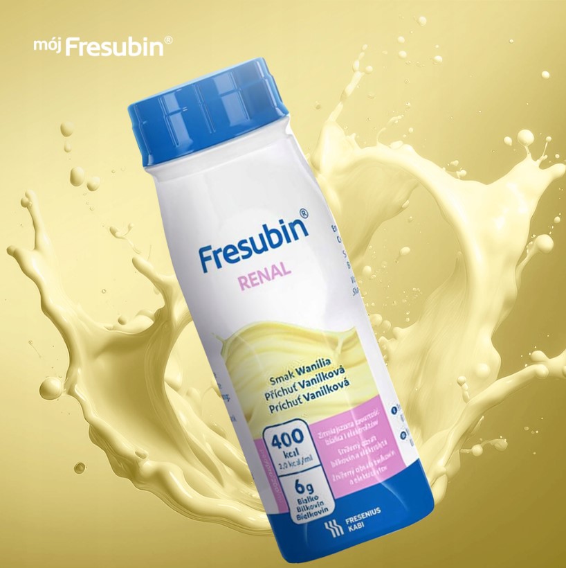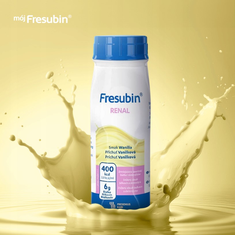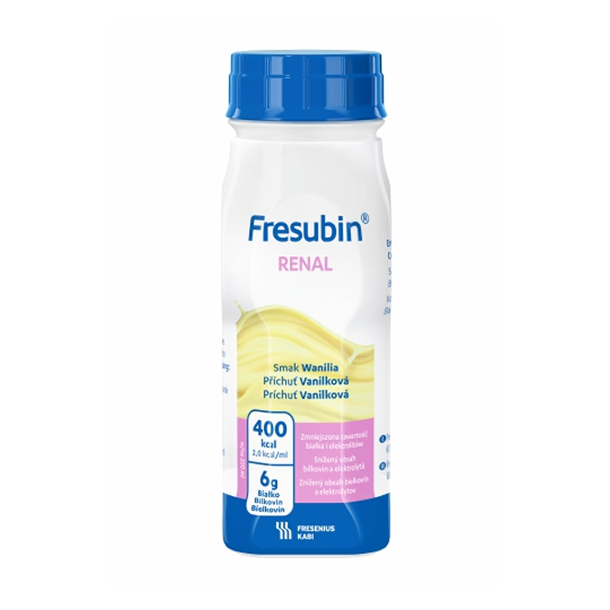 Fresubin Renal, smak waniliowy. Kompletna dieta wysokoenergetyczna (2,0 kcal/ml), o zmniejszonej zawartości białka (6% energii) oraz elektrolitów: sodu, potasu, fosforu, przeznaczona do żywienia drogą doustną lub przez zgłębnik. Zawiera węglowodany o spowolnionym uwalnianiu, błonnik oraz olej rybny. Klinicznie wolna od laktozy, bezglutenowa.