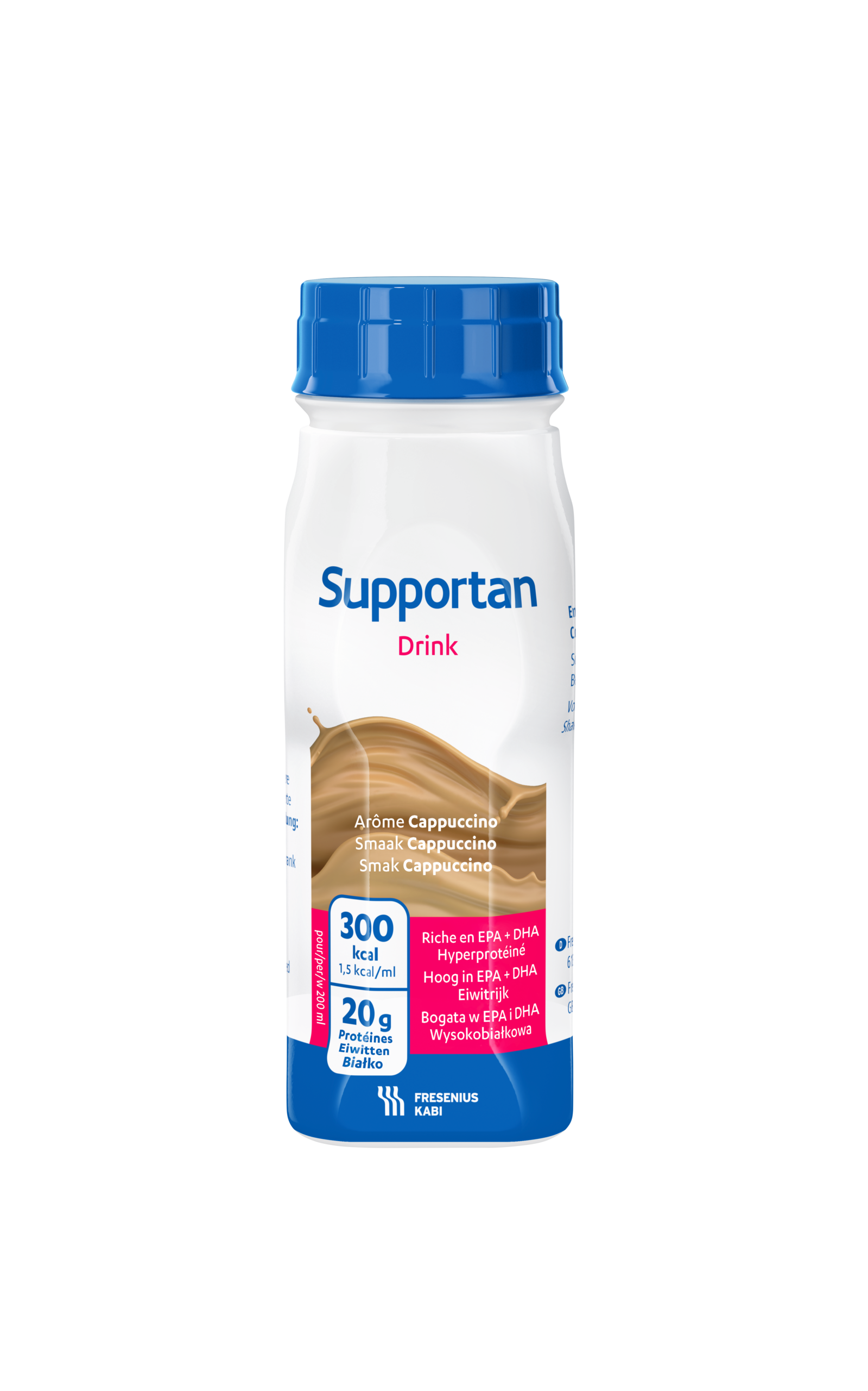 Supportan DRINK, smak cappuccino. Kompletna dieta wysokoenergetyczna (1,5 kcal/ml), wysokobiałkowa, bogata w tłuszcz oraz EPA i DHA pochodzące z oleju rybnego, przeznaczona do żywienia drogą doustną. Zawiera błonnik oraz MCT. Klinicznie wolna od laktozy, bezglutenowa.